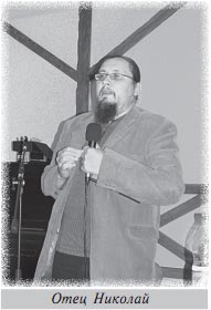 В. Л. Вы слышали? Как сказала Светлана Степановна, так и сделали!.. Петя, подожди… Вспоминай этого, Козьму Пруткова, и все будет замечательно… А у нас сейчас совершенно конкретный выход буфетчицы. Ирина Анатольевна! И. ПоповаБондаренко. Моя смена… Здрасьте. Я буду петь. Петь я люблю, но не умею… Давно не была в Диком Поле, Филфаковец Саша — красивый (прежде всего, духовно), И вот я опять в Диком Поле, Я вся холодею местами (non comment), За то, что не стало нам силы Мы любим Вас чище, чем прежде, Вас любим домашней, чем прежде, В. Л. Вот пока мы здесь пируем, веселимся, отдаем концы, забираем их обратно — есть на корабле человек, который взирает на всю суету как бы со стороны: это отец Николай… О. Николай. О Высоком Небе пару слов… Так сложилось, что некоторых присутствующих здесь я знаю лично очень много лет. Думаю, большинство друг о друге слышали, а вот теперь мы можем посмотреть друг на друга… Есть нечто, что касается каждого из нас. В молодости я совершил «паломничество на Восток». Кто из нас, здесь сидящих, не увлекался восточными делами? Что же нужно было, чтобы освободиться от этого невероятного аромата Востока, невероятно глубокой культуры, которую я очень люблю?..
